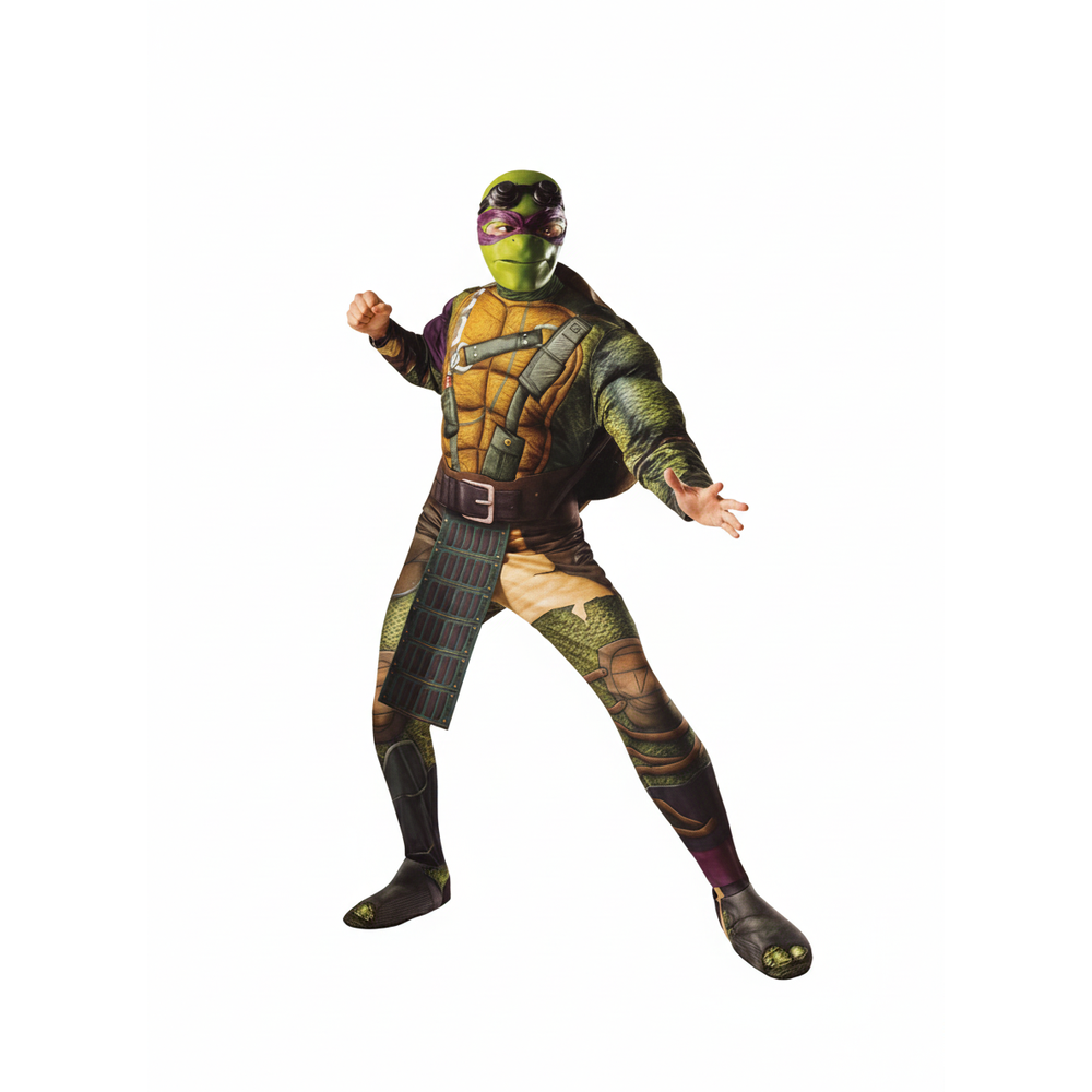 • Ce déguisement de Donatello se compose d’une combinaison, une ceinture, un masque et la carapace.