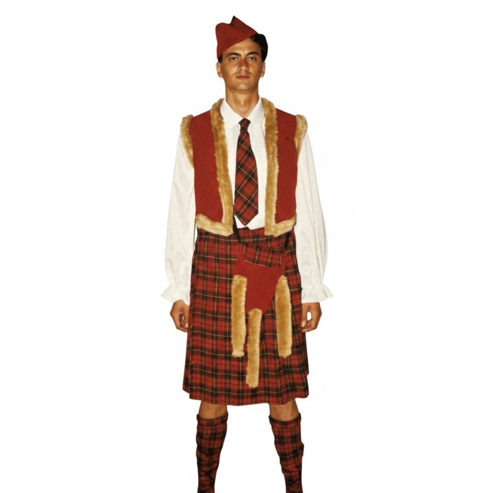 • Ce déguisement d’Ecossais Rouge se compose d’une jupe, un haut, un gilet, une cravate, deux jambières, un sac.