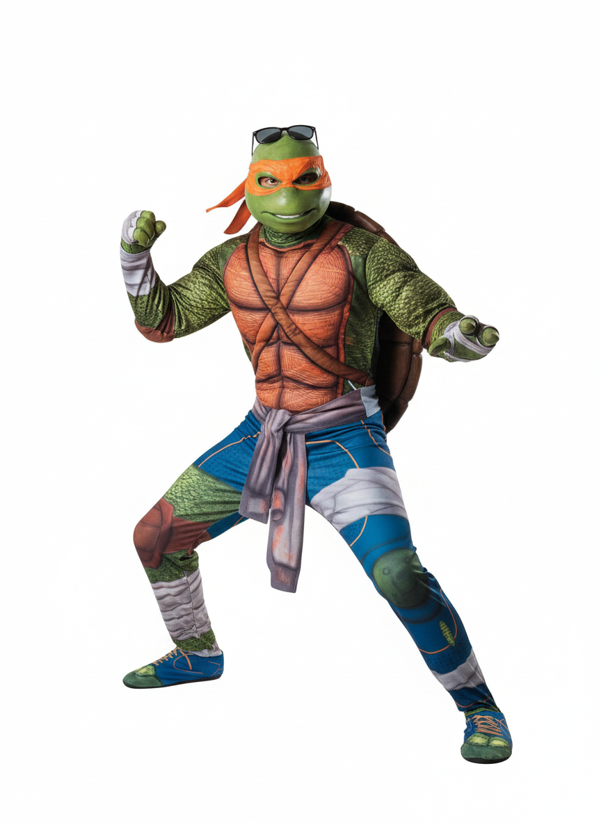 • Ce déguisement de Raphael se compose d’une combinaison, une ceinture, un masque et la carapace.