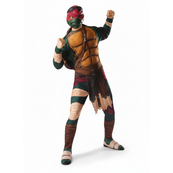 • Ce déguisement de Raphael se compose d’une combinaison, une ceinture, un masque et la carapace.
